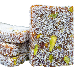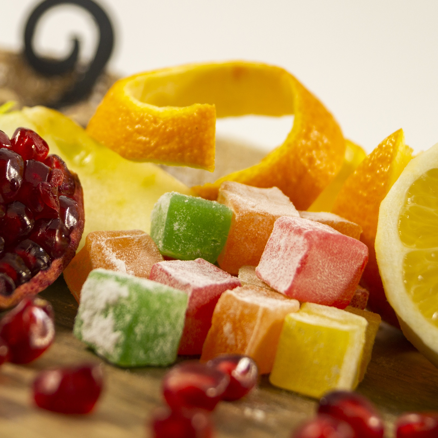 Delicias turcas con sabor a Granada y pistacho de alta calidad con decoración recubierta Textura suave Embalaje de caja de fruta real